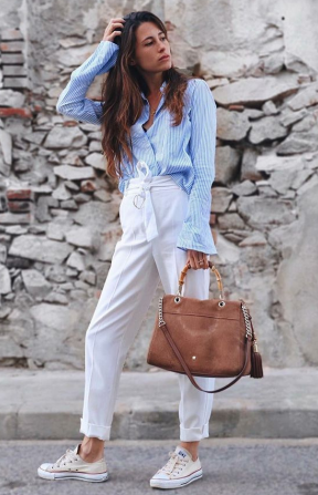A próxima calça clochard é no estilo pantacourt com tênis e traz um visual confortável e descontraído. Se trocássemos o cinto por um mais arrumado estruturado, o look ficaria bem mais arrumado e elegante.